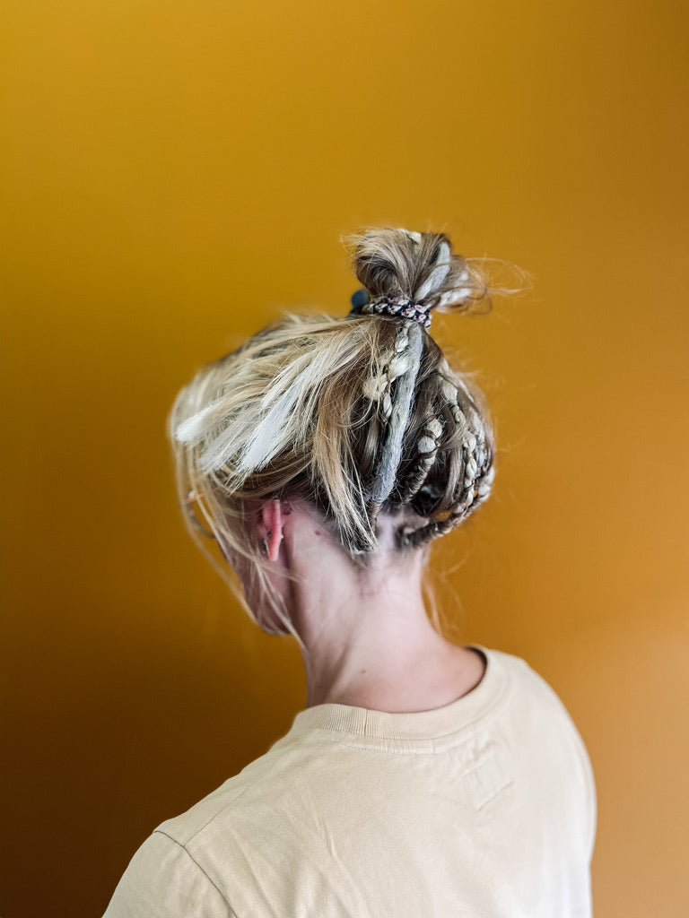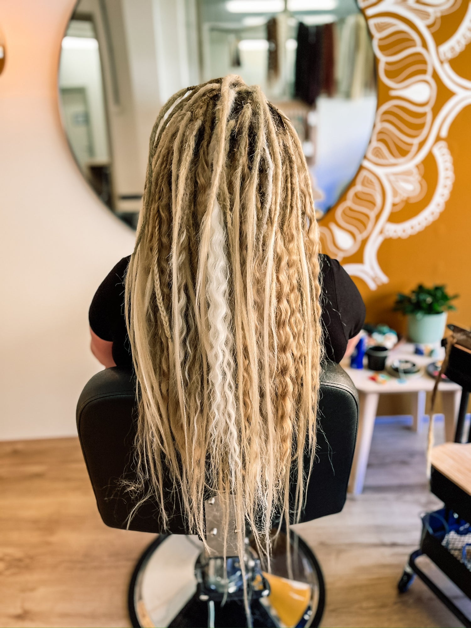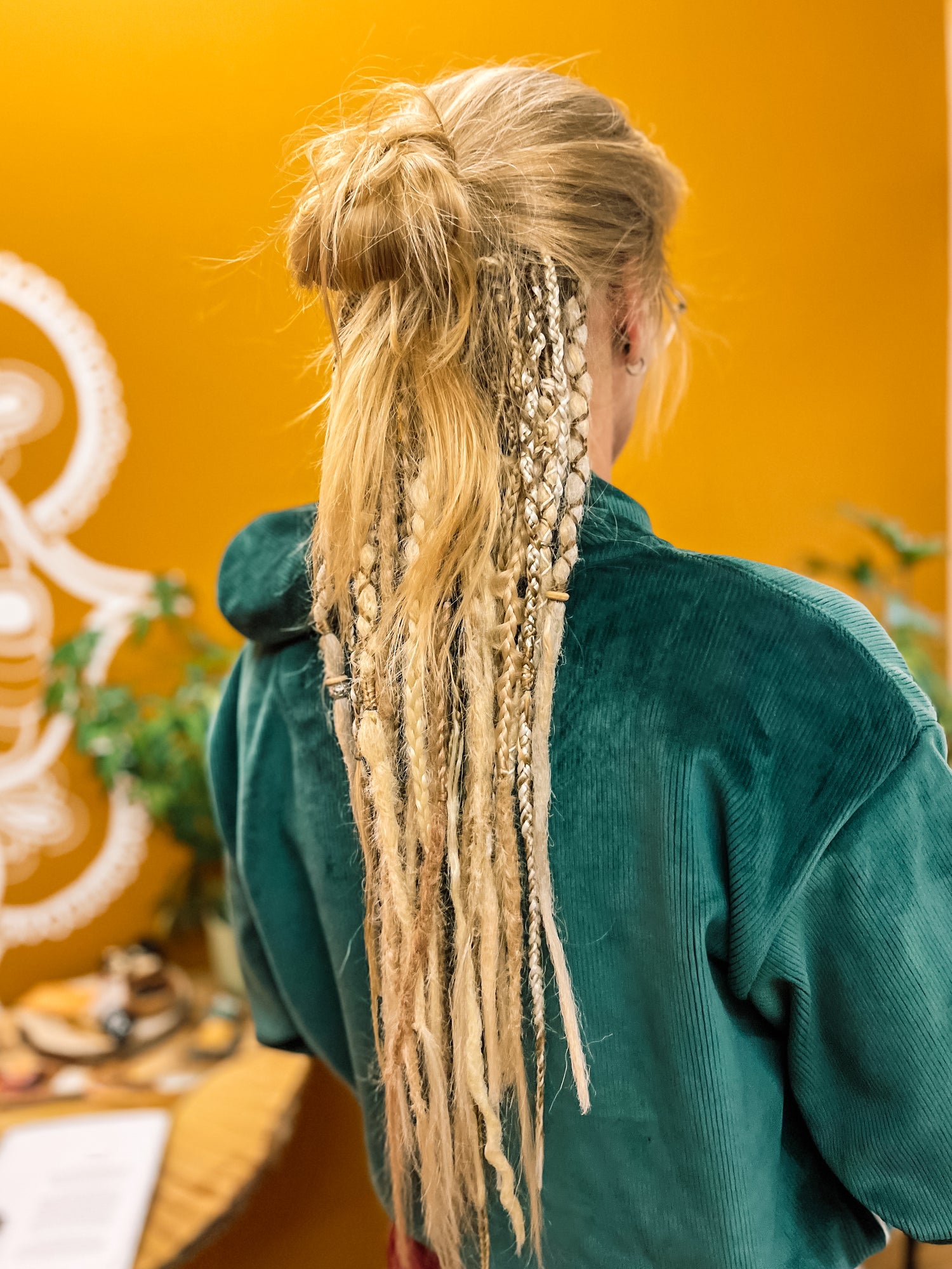 De dreadlocks worden strak (maar niet te strak!) ingezet; naarmate je haar groeit, zakt de aanzet iets naar beneden. Wanneer je ze wilt laten vernieuwen is volledig aan jou — maar 2 à 3 maanden is een fijne richtlijn. Tegen die tijd begint je eigen haar bij de aanzet vaak ook al wat te knopen/dreaden.