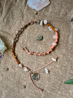 Deze handgemaakte macramé hairwrap is geknoopt van gewaxed linhasita koord in warme, zachte tinten bruin, roze en taupe. Een harmonieuze kleurencombinatie die rust en vrouwelijkheid uitstraalt. De wrap is versierd met rozenkwarts, de steen van liefde, zachtheid en zelfcompassie.