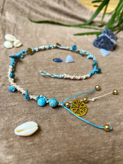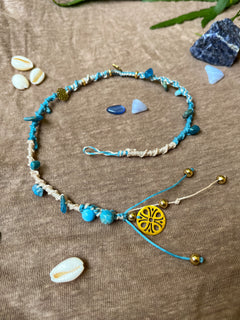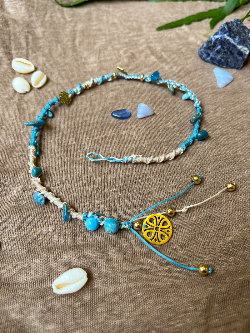 Deze handgemaakte macramé hairwrap is geknoopt van gewaxed linhasita koord in frisse tinten lichtblauw en wit – licht, helder en bijna dromerig van uitstraling. De wrap is afgewerkt met apatiet, een edelsteen die staat voor inspiratie, zelfexpressie en het vrij laten stromen van energie.