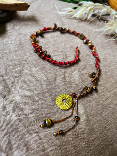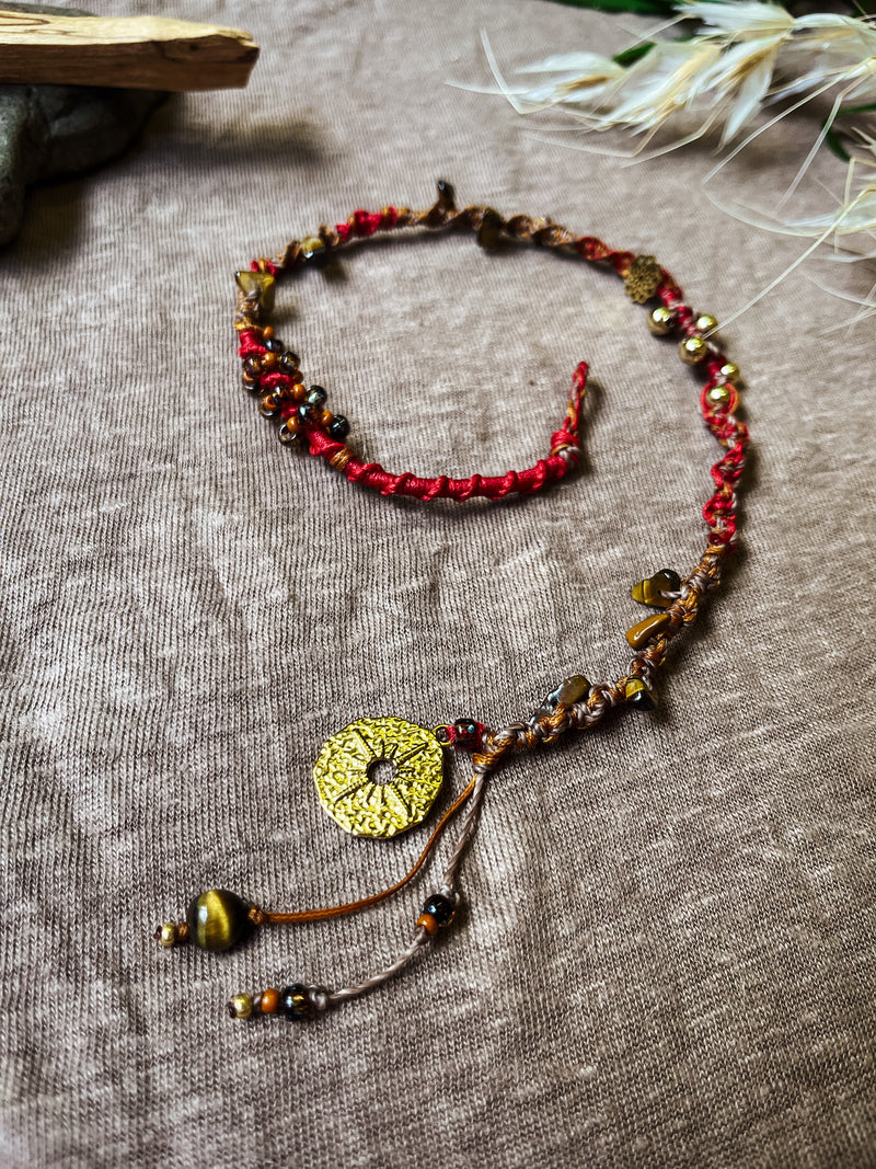 Deze handgemaakte macramé hairwrap is geknoopt van gewaxed linhasita koord in diepe tinten rood en bruin – warm, aards en krachtig van uitstraling. De wrap is afgewerkt met tijgeroog kralen, een edelsteen die staat voor moed, bescherming en stevig in je kracht staan.